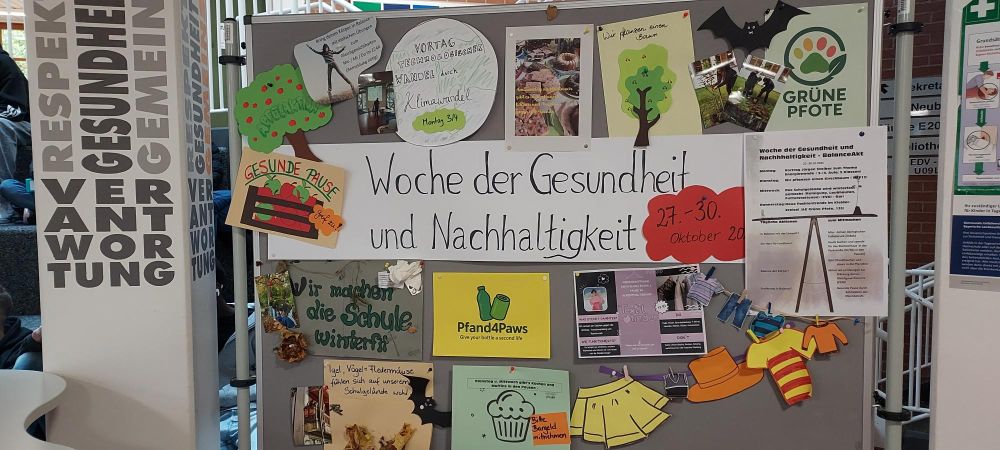Vom 27.-31.10 fand an unserer Schule wieder die vom Ministerium vorgeschlagene Woche der Gesundheit und Nachhaltigkeit statt. Eine Woche lang werden Aktionen rund um einen gesunden Lebensstil und Nachhaltigkeit durchgeführt. Heuer war die neugegründete AG „Grüne Pfote“- eine Arbeitsgemeinschaft aus interessierten Schülerinnen und Schülern im Bereich Umwelt, Tierschutz und Nachhaltigkeit, federführend. Hier nur ein kleiner Auszug der Aktionen, die in dieser Woche durchgeführt wurden:
