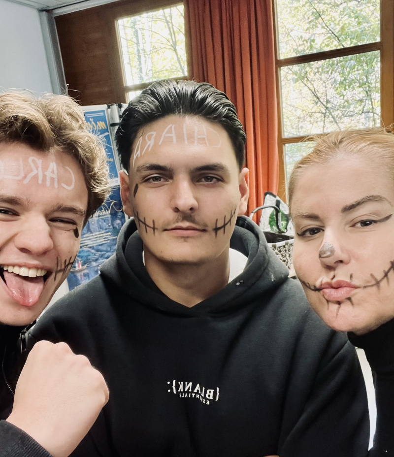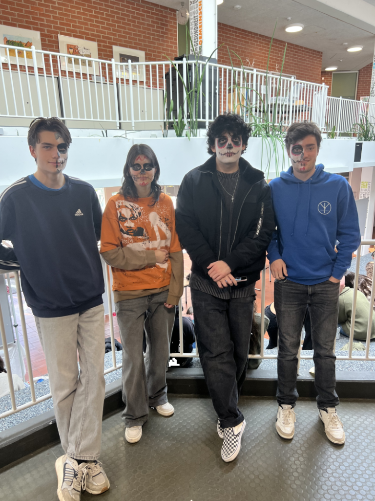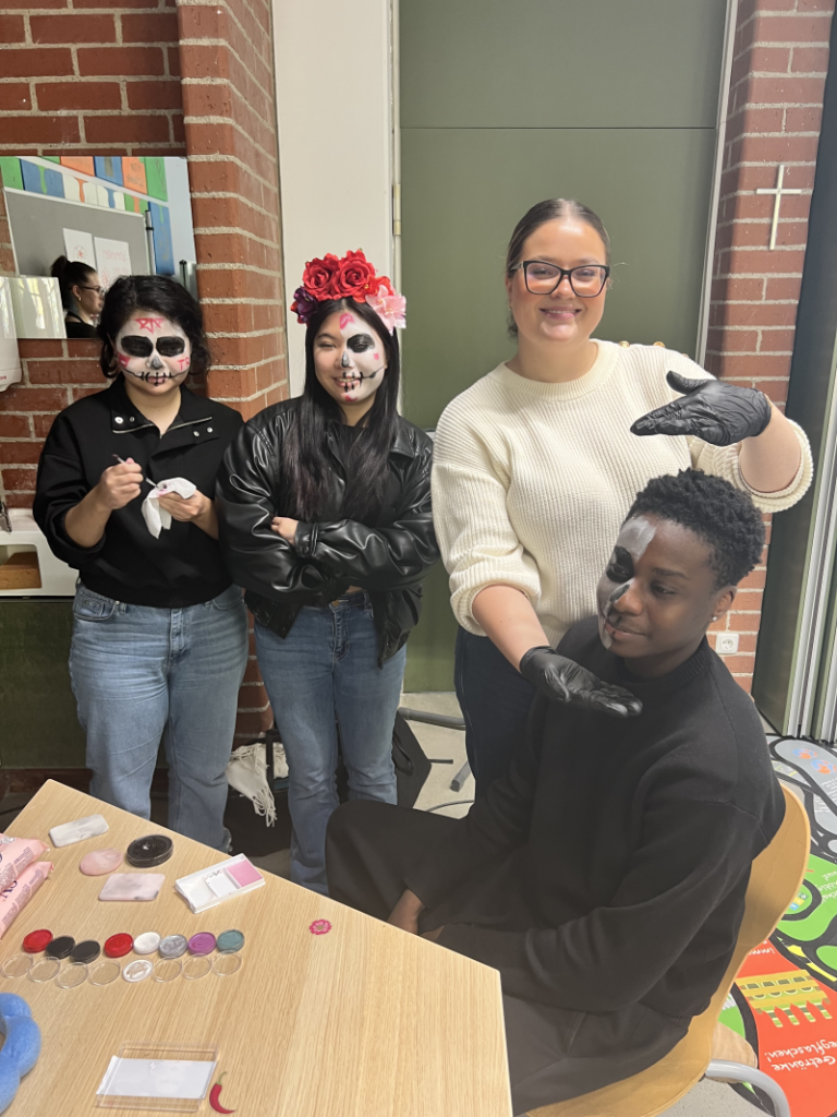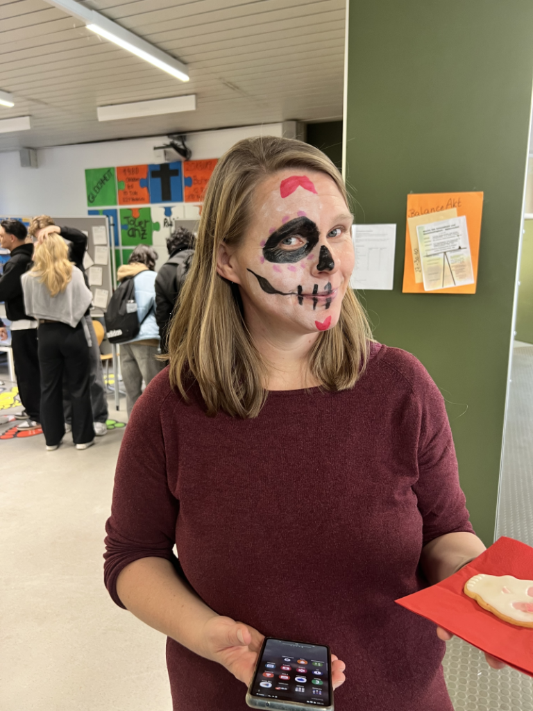 Typisch für diese Tradition sind bunt geschmückte Gedenk-Altäre (Ofrendas) mit Fotos, Kerzen, Blumen und kleinen Gaben wie Speisen oder Getränken – all das war auch bei uns zu sehen. Viele Schülerinnen und Schüler ließen sich die Gesichter kunstvoll bemalen, inspiriert von den berühmten „Catrinas“ (Totenkopf-Motiven).