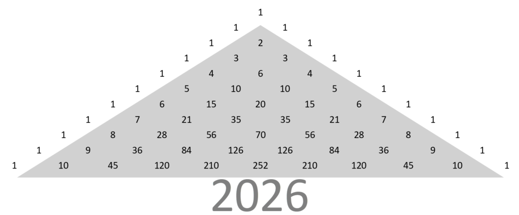 Und im PASCAL´SCHEN Dreieck findet man die 2026 auch. Summiert man alle Zahlen im grauen Dreieck, so erhält man die aktuelle Jahreszahl.